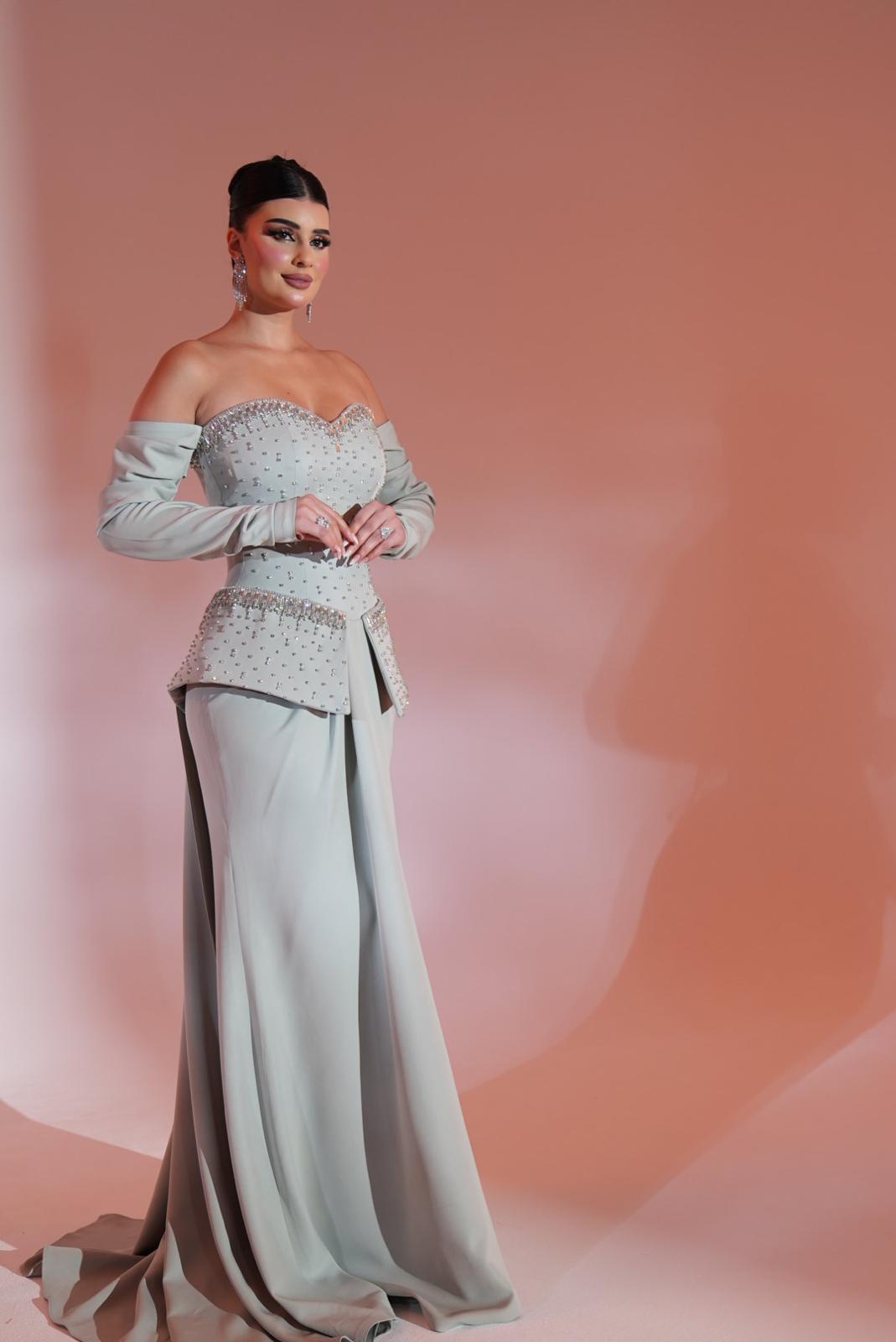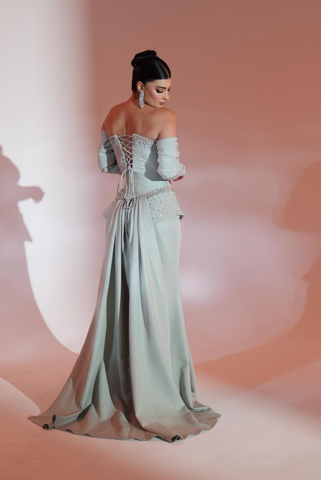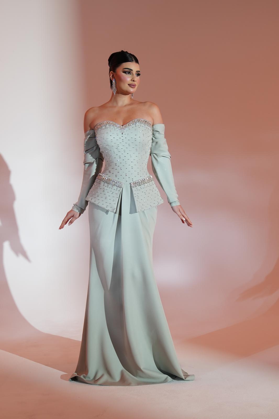 Light Tiffany color Korean crepe dress, hand-embroidered.