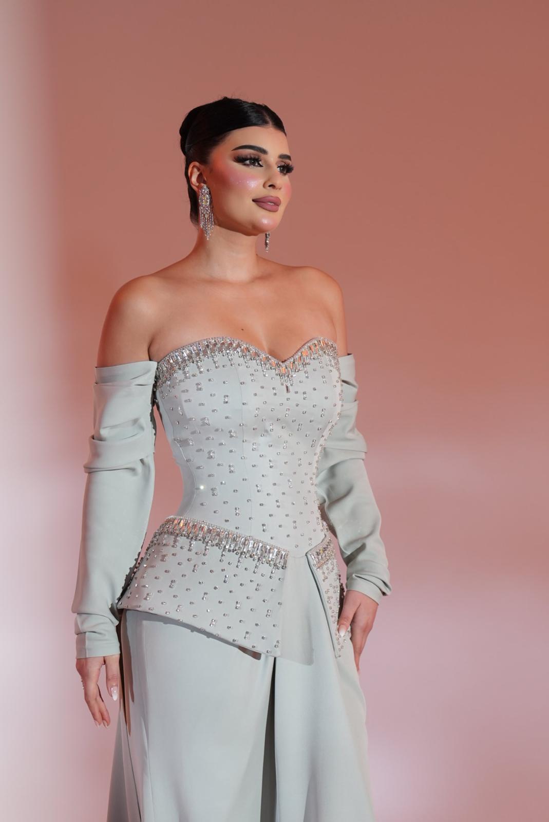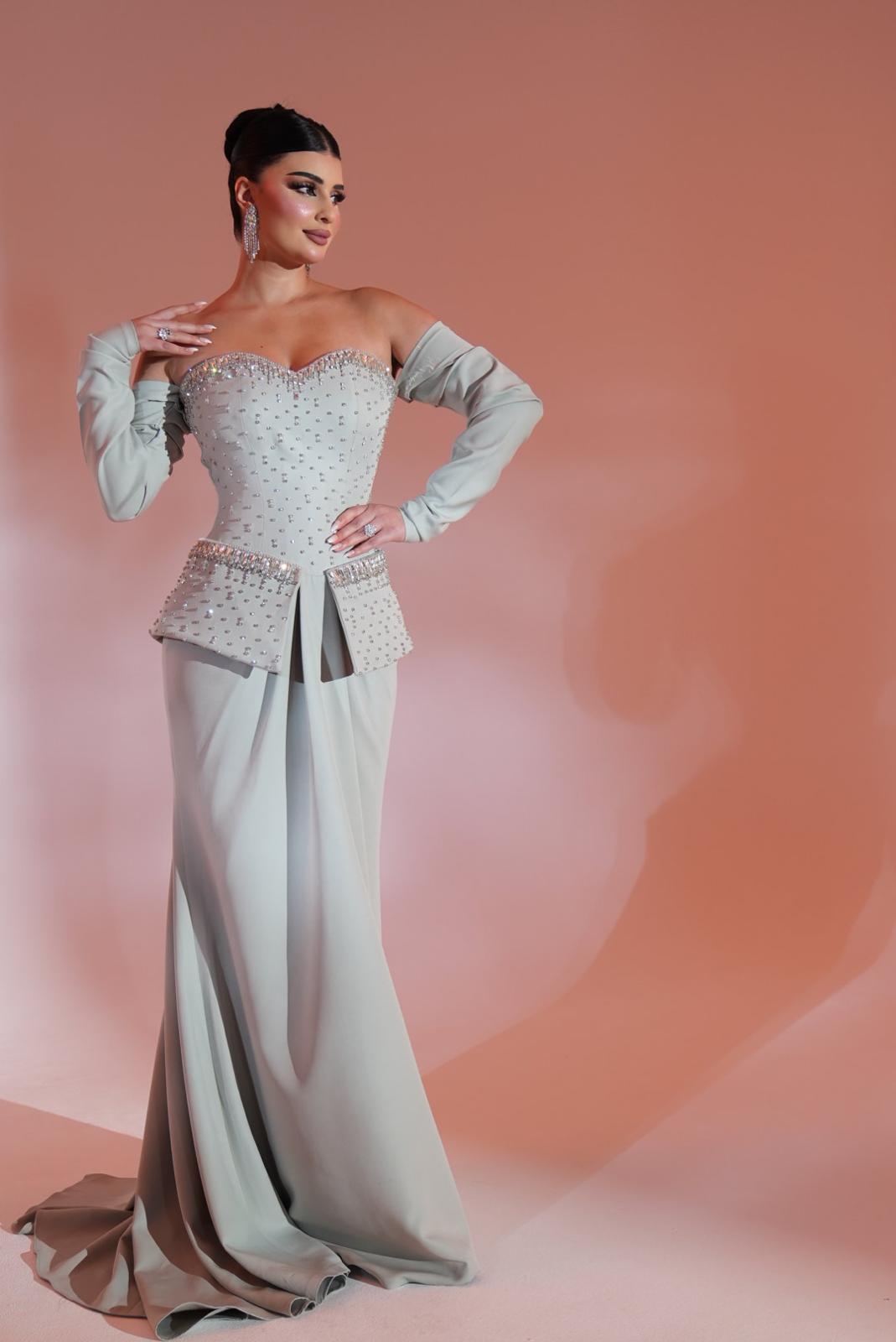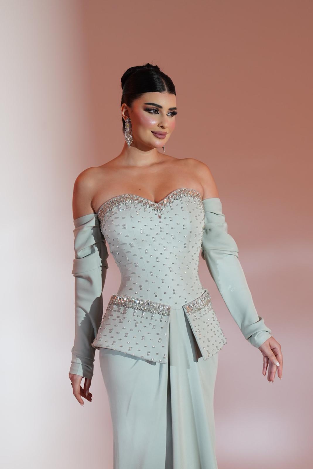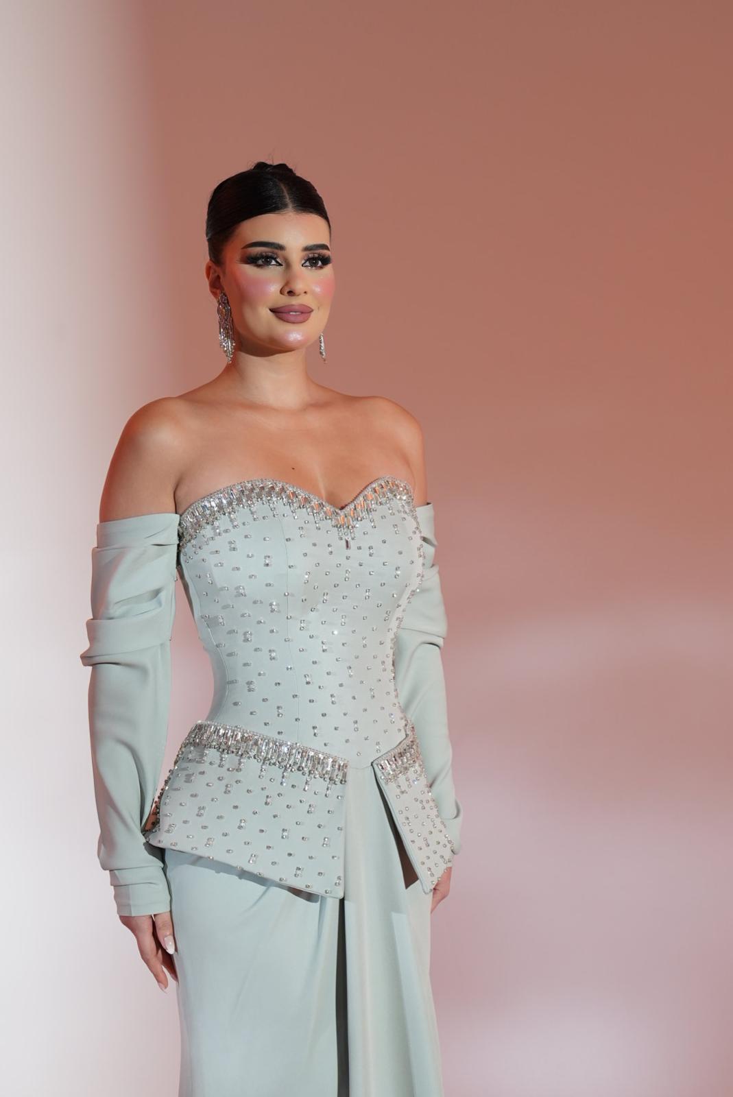 Light Tiffany color Korean crepe dress, hand-embroidered.