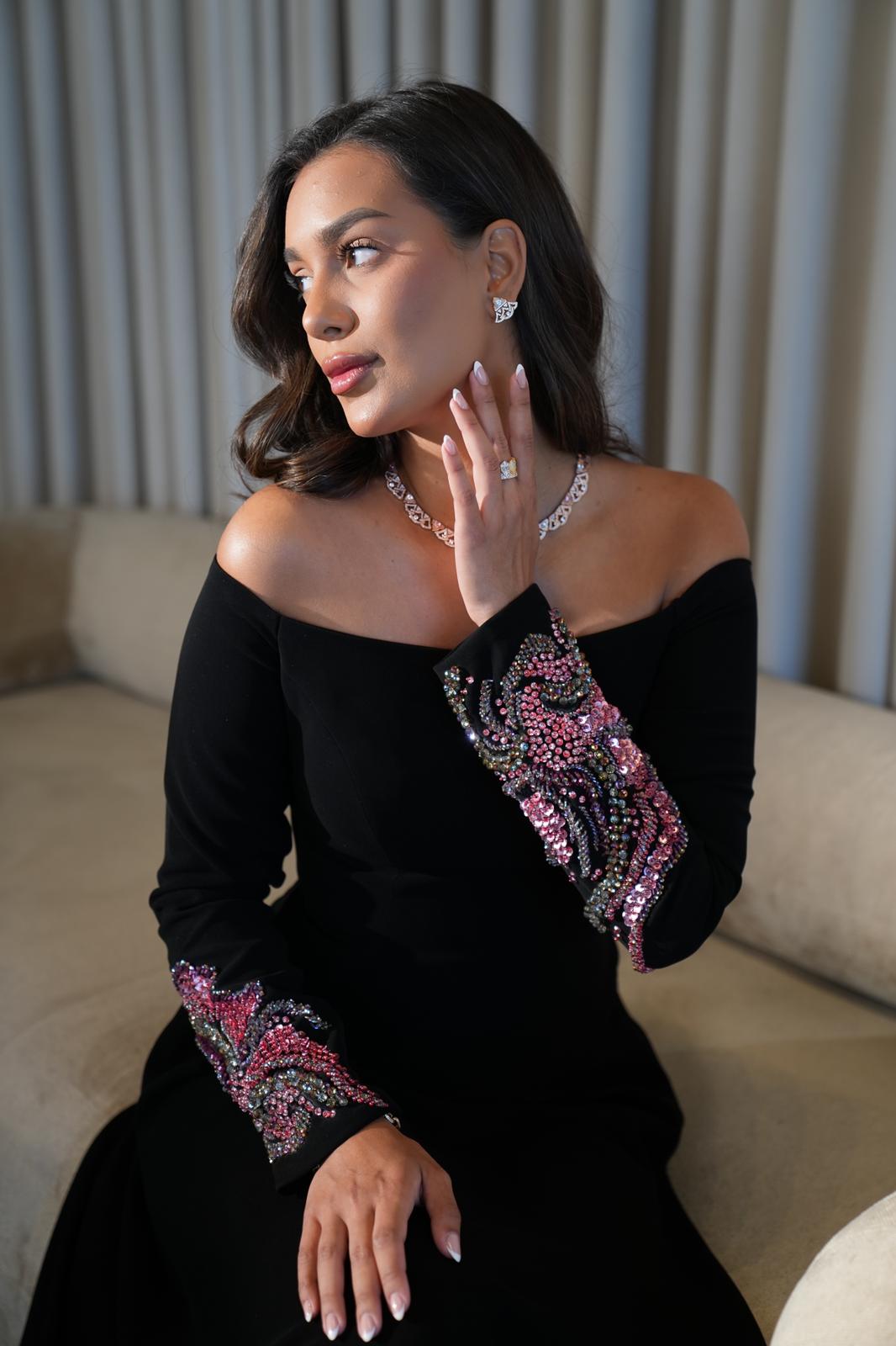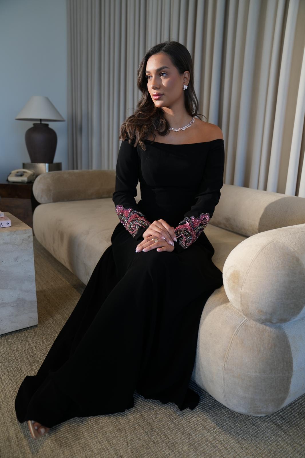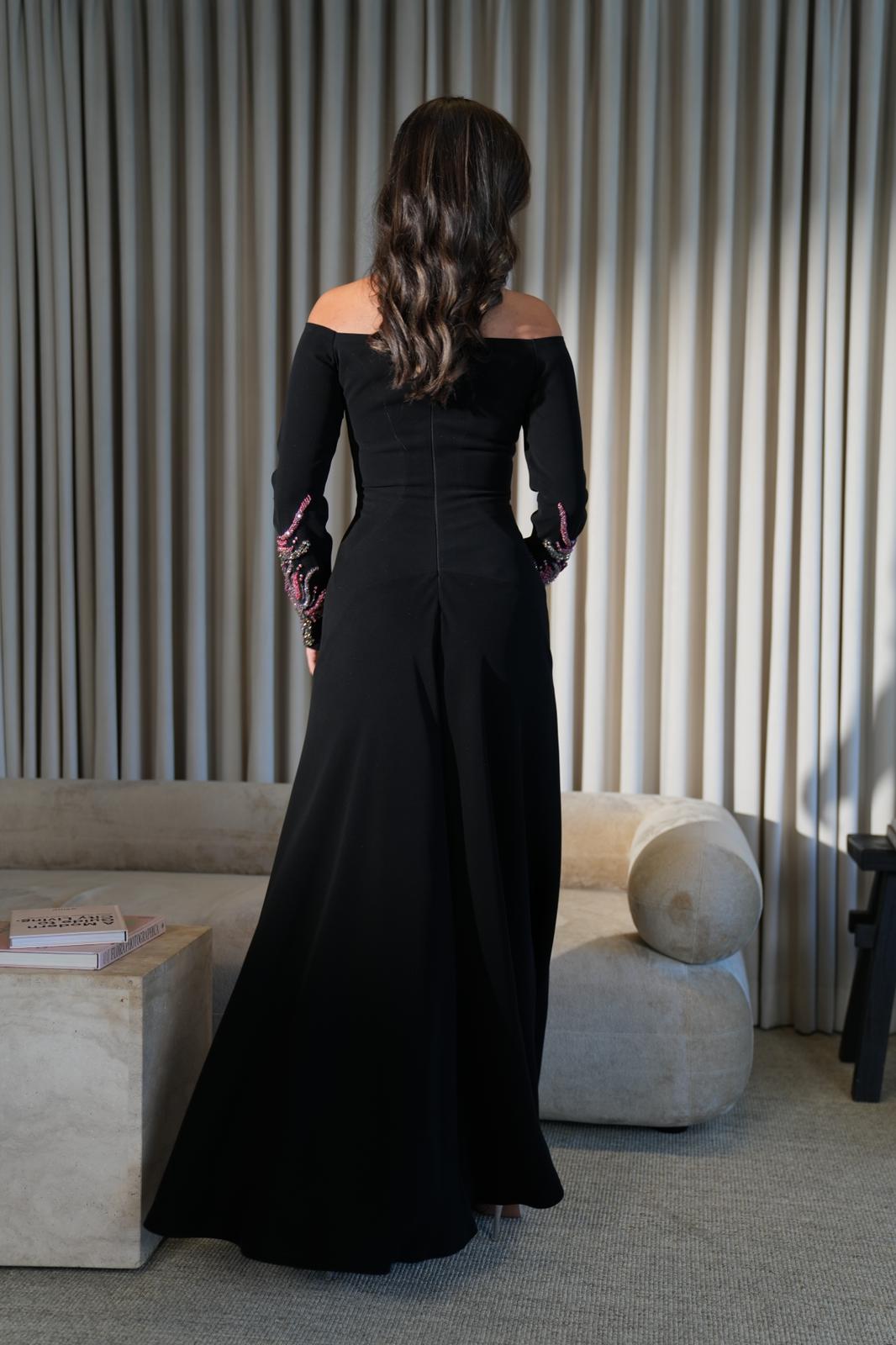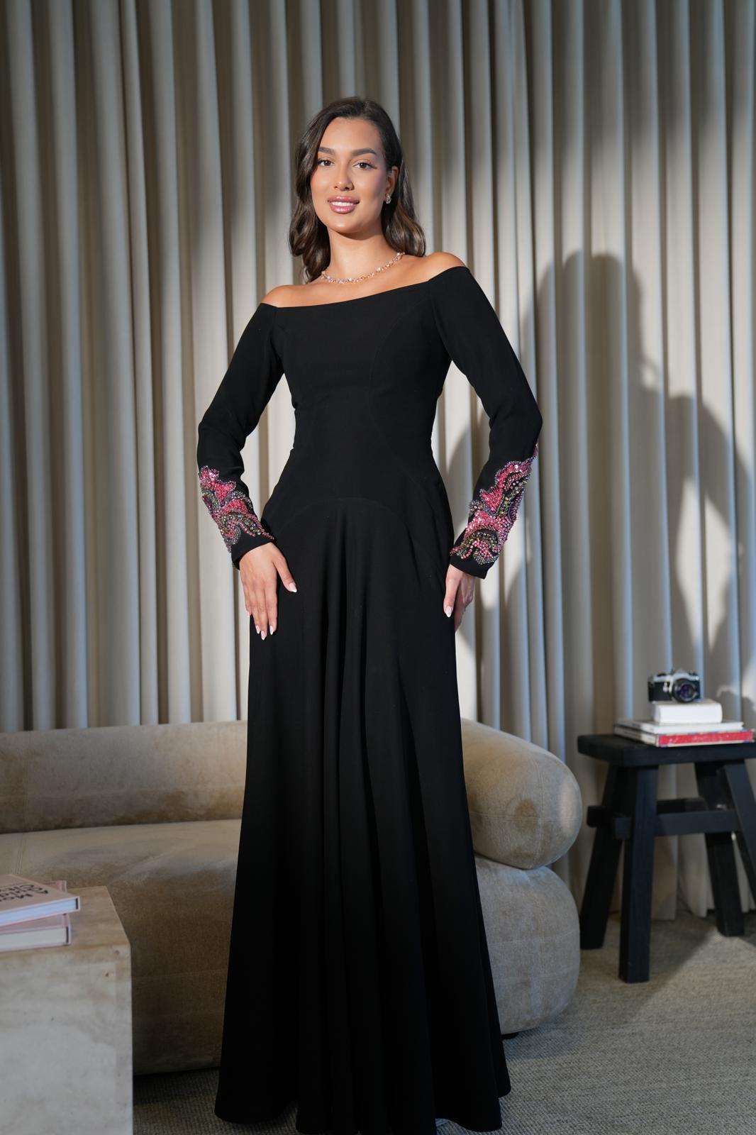 فستـان خام كريب اسود والاكمام مشكوكه شك كامل يدوي .. يرجى اختيار المقاس والطول المناسب